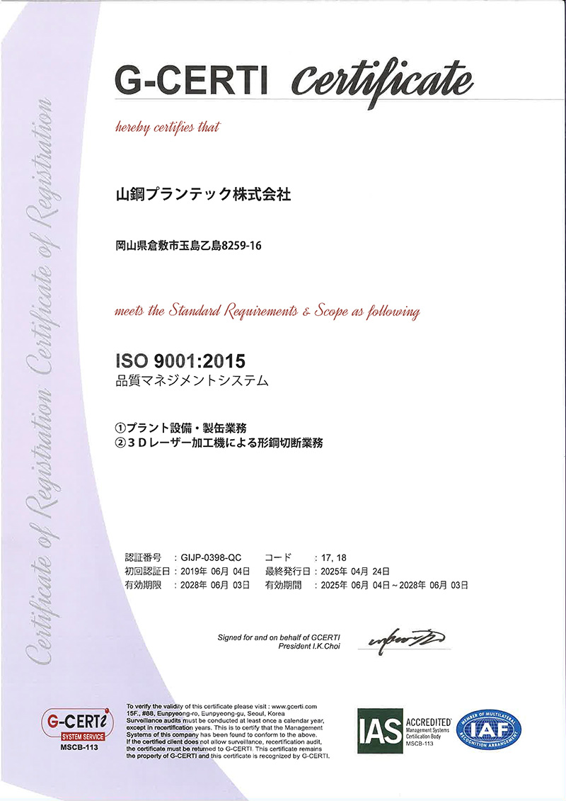 山鋼プランテックは国際規格である ISO9001(品質マネジメントシステム)を2019年6月に認証取得致しました。お客様のご期待に応えられるよう、信頼される品質の確保・向上、有益な情報・サービスの提供が行えるシステムの構築に社員一丸となり取り組んで参ります。これからも “ チャレンジ ” し続ける「山鋼プランテック」にご期待下さい。
